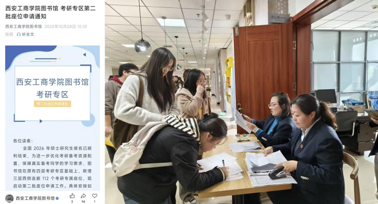 2026 年全国硕士研究生招生考试报名工作落幕,考研备考进入冲刺关键阶段。为优化校内考研、考公备考资源配置,切实满足学子学习需求,西安工商学院图书馆近期顺利完成考研专区第二批座位的申请与安排工作。