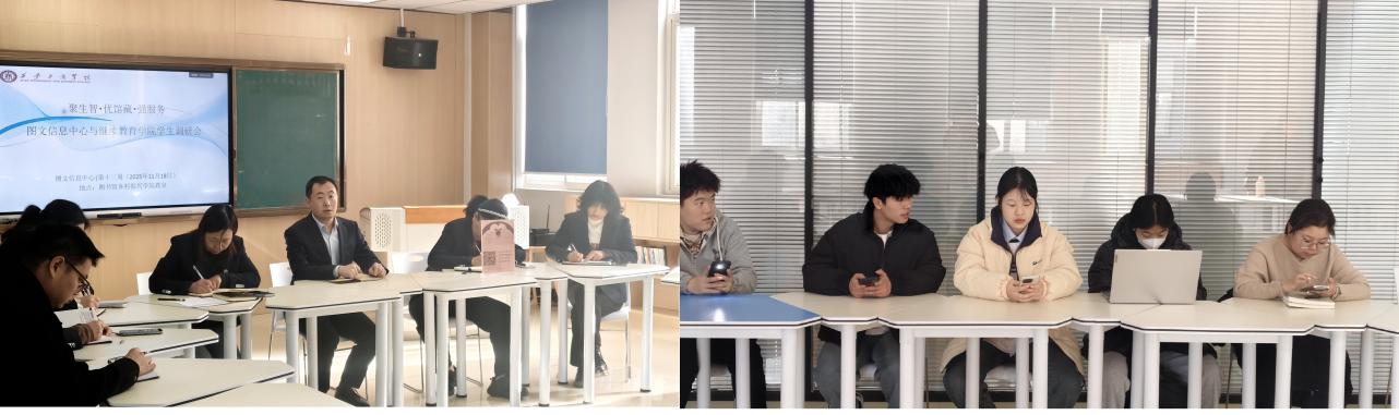2025年11月18 日,图文信息中心与继续教育学院学生调研座谈会在图书馆四层乡村振兴学院教室召开。图文信息中心全体工作人员、继续教育学院学生代表参会交流,图文信息中心曹磊副主任主持会议,旨在精准收集学生诉求,推动图文信息中心管理的图书馆及校园网服务提质升级。